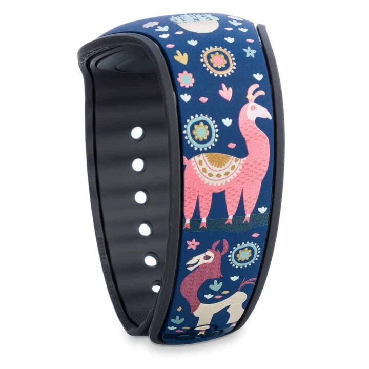 The Emperor's New Groove Magic Band features Kuzco in llama form, surrounded by colorful llamas on a dark blue background.