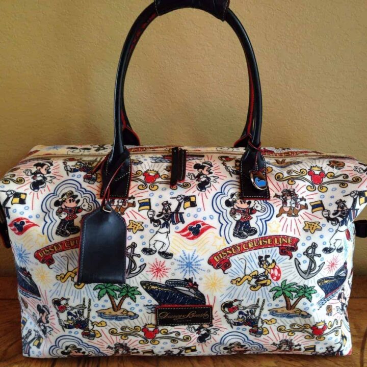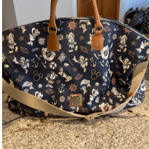 This Dooney and Burke Disney bag was released in conjunction with the Disney Fantasy's inaugural sailings in 2015 and features the different Disney Cruise Line ships along with Captain Mickey. This weekender features a front pocket.