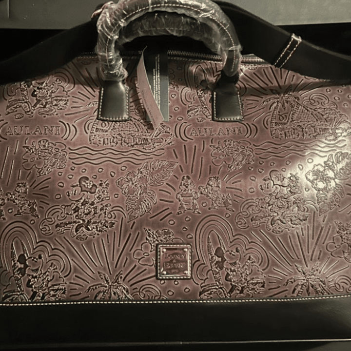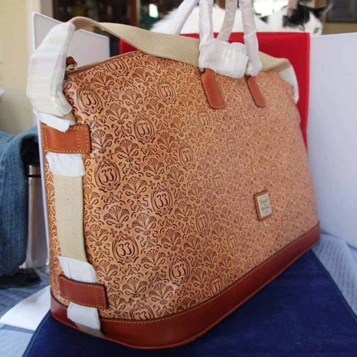 The Club 33 Embossed Leather Weekender with an allover design, features the Club 33 logo embossed on brown leather. While most of the other Disney Dooney weekenders are coated cotton, this bag stands out due to its sturdy leather design.