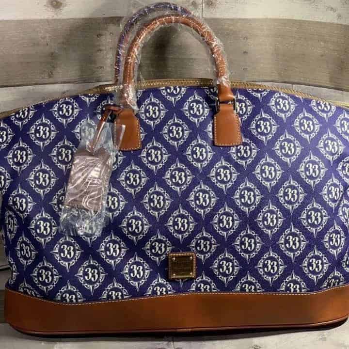 In 2018, Walt Disney World Resort's Club 33 officially opened! This weekender was one of the silhouettes in the Club 33 Walt Disney World Inaugural collection from Dooney & Bourke. The print features a dark blue background and a Club 33 Compass logo repeating throughout the pattern.