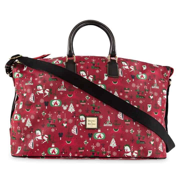 Celebrate the magic of the holidays with this festive Disney Dooney & Bourke duffle bag, featuring ornaments with Disney designs, including Mickey heads, the castle, teacups, Mickey ice cream bars, carousel horses, trains, and more, plus other traditional holiday imagery like reindeer, snowflakes, candy canes, Christmas trees, and stockings.