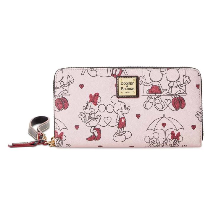 We have rounded up the latest wallets released by Disney Dooney and Bourke. Celebrate Walt Disney World's 50th Anniversary with the Celebration Wallet by Disney Dooney & Bourke. The allover print features some of the most recognizable icons of the Florida theme parks, including Spaceship Earth, the Tree of Life, Cinderella’s Castle, Mad Tea Party and the Tower of Terror. Characters featured on the print include Figment, Tinker Bell, Orange Bird, Alice, Woody, Remy, Simba, Madame Leota and more. The wallet features a zipper closure, an interior zipper compartment, twelve interior card slots, and a removable leather wrist strap. Retail price: $168 Show your status as a Disney Vacation Club Member with this chic Disney Dooney and Bourke Wallet! The wallet features a colorful all-over print of Disney Vacation Club member patches. Mickey is included on the print along with symbols representing many of the Disney Vacation Club resorts, including Aulani, Beach Club, Fort Wilderness, Animal Kingdom Villas, Polynesian Villas, and many more. Retail price: $168 Go down the rabbit hole with the Alice in Wonderland Wallet by Disney Dooney & Bourke. The allover Alice in Wonderland print is done in a black and white sketch style and features characters such as Alice, Cheshire Cat, Queen of Hearts, White Rabbit, Mad Hatter, Tweedle Dee, and Tweedle Dum. Retail price: $168 Visit the Windy City with Mickey Mouse! The Disney Dooney and Bourke Chicago Wallet features some of the icons of Chicago, including Chicago-style hot dogs, deep dish pizzas, footballs, baseballs, sailboats, comedy and tragedy masks, hearts, waves, and music notes on the all-over pattern. The wallet has a snap closure, exterior zipper pocket, eight card slots and more. Retail price: $128 Love is in the air! Mickey and Minnie Mouse are the stars of the Valentine's Day 2022 Wallet by Dooney and Bourke. The pattern features simple line drawing artwork with hearts sprinkled throughout the design. The wallet has a zipper closure with braided leather pull and a removable wrist strap with red edging. Retail price: $168Latest Disney Dooney and Bourke Wallets