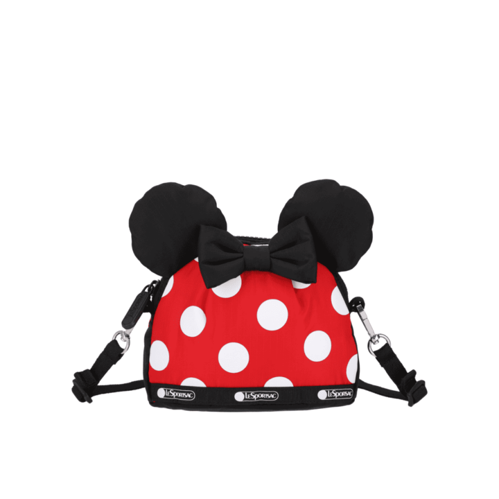 Features puffy mouse ears and bow at top, Zip main closure, Interior back wall open pocket, 1.5in/3.5cm wide adjustable/detachable webbing strap (Max length: 40 in/101.6 cm, Min length: 33in/84cm)