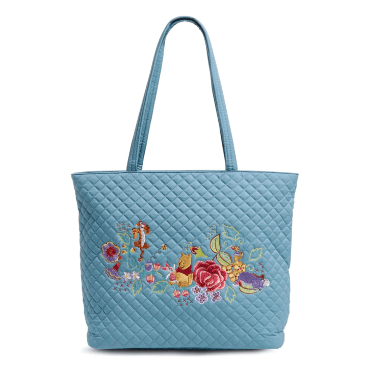 The Winnie the Pooh x Vera Bradley collection features a cornflower blue quilted fabric with embroidered details of Winnie the Pooh, Piglet, Eeyore, Tigger and Roo.