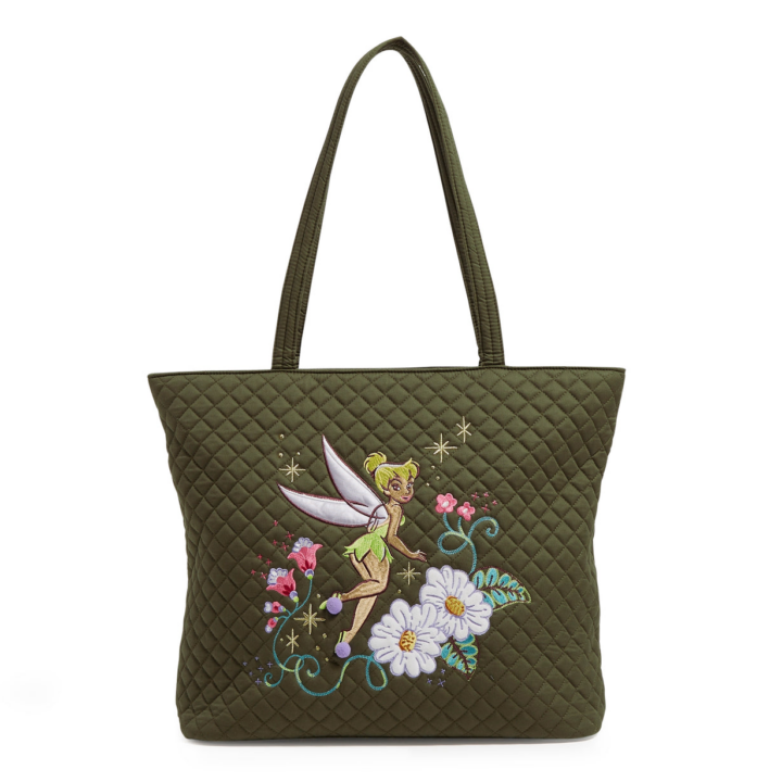 The Peter Pan x Vera Bradley collection features a olive quilted fabric with embroidered details of Tinker Bell, along with floral accents. Additionally, the small tote bag features both Tinker Bell and Peter Pan.